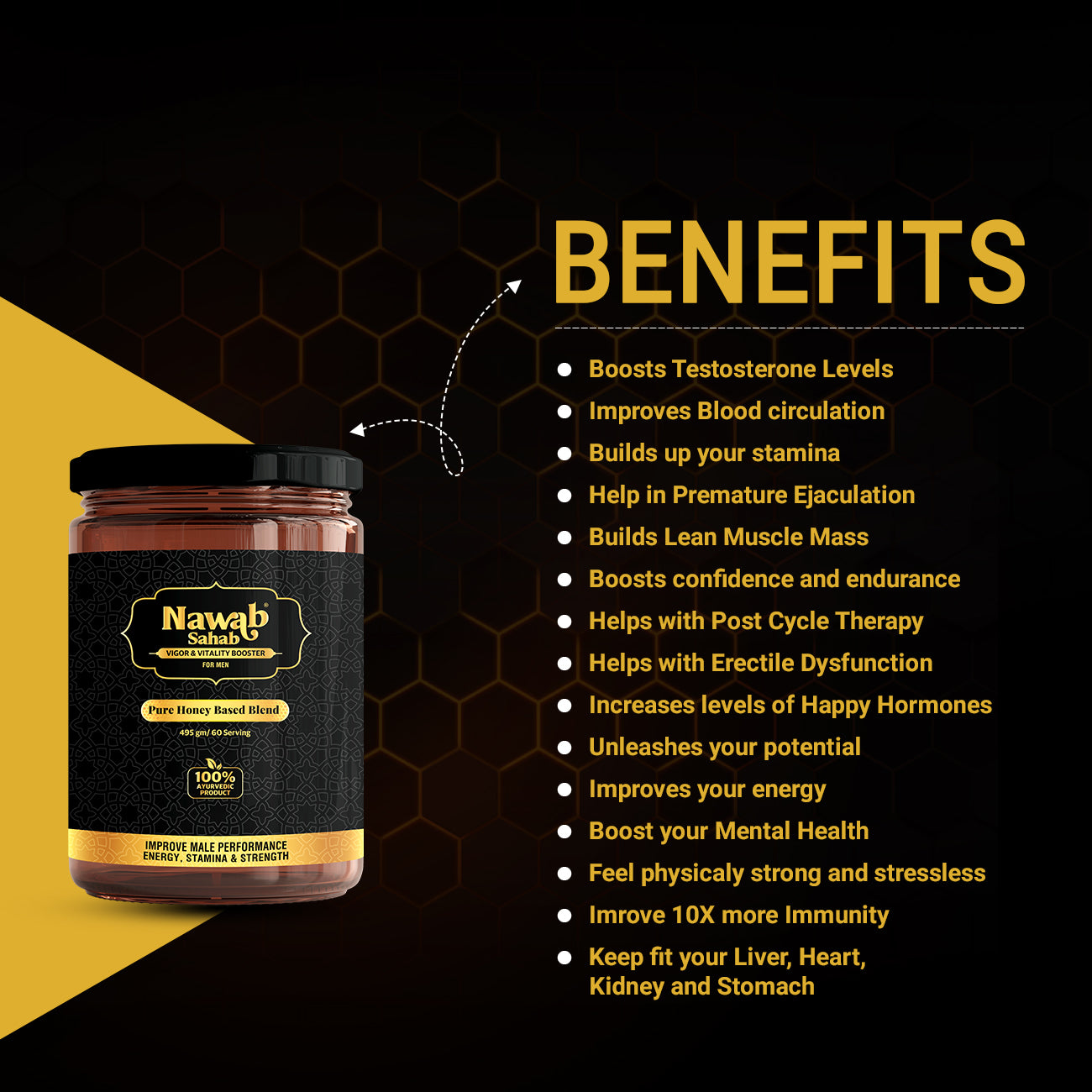 No Flavors, No Artificial Ingredients, No Added Preservatives, No Added Sugar. Made with 24+ potent herbs that build up long-lasting stamina and energy over time.