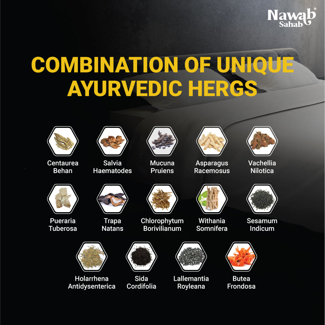 Nawab Sahab Enhancer Powder is an Ayurvedic formulation designed to improve sexual well-being and restore vitality and strength in men. It effectively manages various sexual conditions such as premature ejaculation, impotence, and erectile dysfunction. Additionally, it helps in reducing stress and anxiety caused by an unhealthy lifestyle.