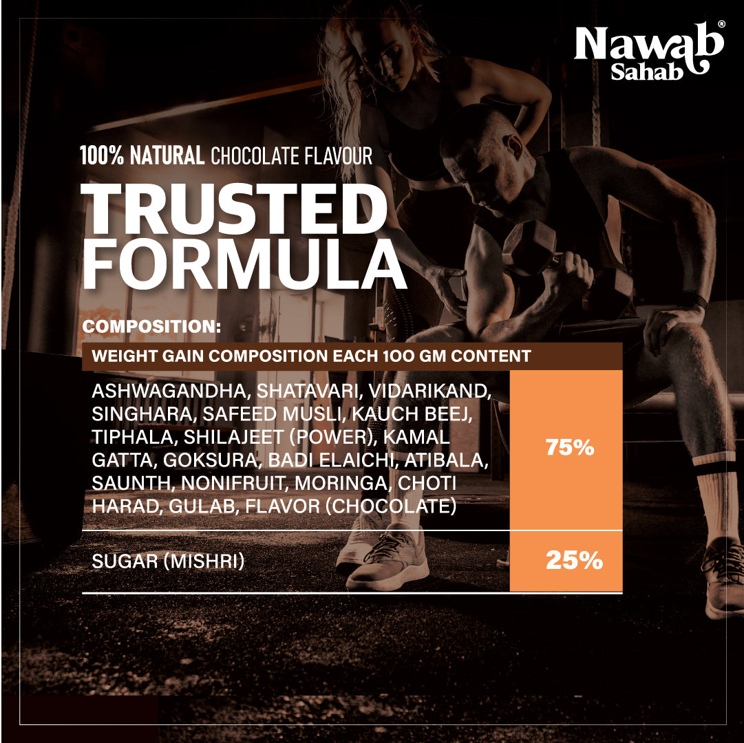 Nawab Sahab Weight & Muscle Gainer is a premium supplement designed to help you gain weight, build muscle, boost energy, and enhance strength. It is made with natural ingredients and offers a delicious chocolate flavor.